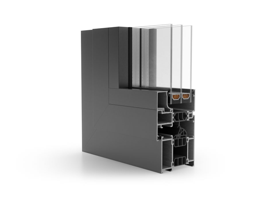 CS 77 ist ein Aluminiumsystem mit thermischer Trennung, das Design und hohen thermischen Komfort mit optimaler Sicherheit verbindet. Es ist auch mit einem versetzten T-Rahmen (ohne Nase) erhältlich.